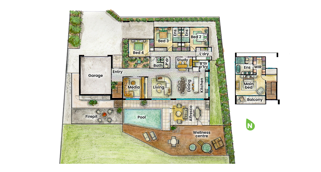 Natural timber finishes, soft earthy tones and timeless leather accents create a warm, grounded feel throughout. Upstairs, a separate parents’ retreat offers quiet space to recharge, while downstairs living, media and guest rooms bring everyone together. The study adapts as needed – closed for focus or opened to connect with the main living and outdoor areas. It’s a home that makes entertaining easy, family time natural and everyday life feel balanced.