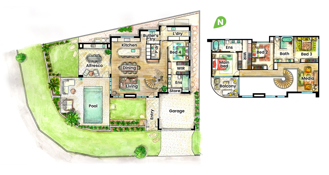 Two opulent main bedroom suites - one on each level - offer privacy and retreat, while a clever Jack and Jill layout connecting the additional bedrooms makes hosting family and guests effortless.